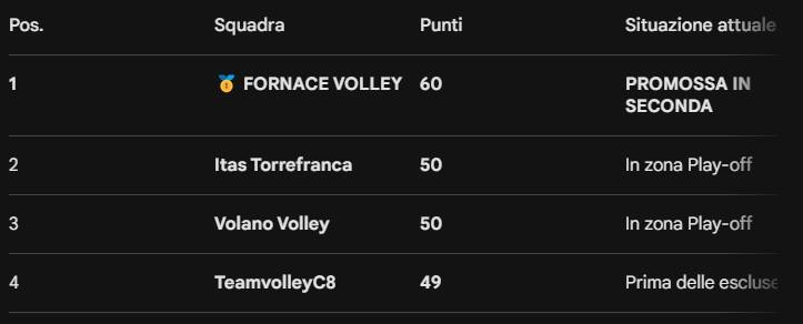Non c'è stata storia. Il Fornace ha onorato il titolo di Regina della categoria con una prestazione impeccabile, regalando ai propri tifosi una vittoria nel derby che è il coronamento perfetto di una stagione da record. Ma mentre le ragazze di mister Lavisolo festeggiavano, la classifica alle loro spalle subiva uno scossone inaspettato.